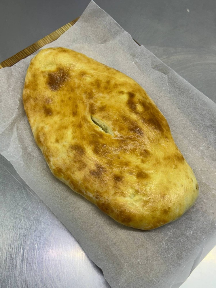 Хачапурі з м'ясом та сиромТісто, свинина, цибуля, моцарела, сулугуні